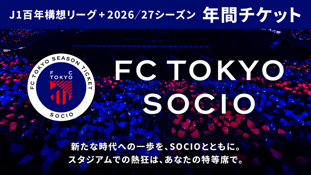 FC東京では年間チケット(SOCIO)を、シーズン移行期の特別大会『明治安田J1百年構想リーグ』と『2026/27明治安田J1リーグ』をあわせた1.5シーズン(2026年2月~2027年5月)として販売いたします。