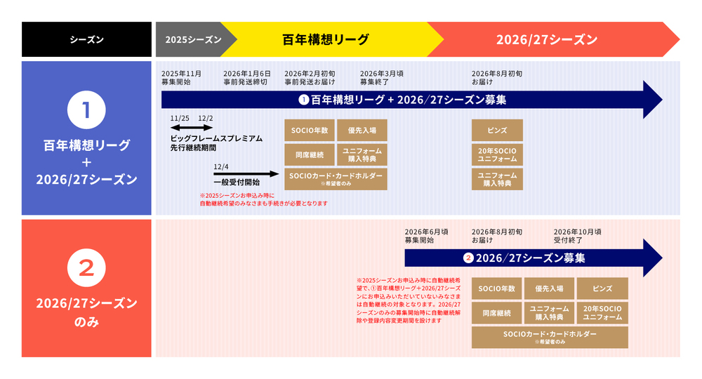 ※百年構想リーグ+2026/27シーズンの1.5シーズンにてお申込み手続きが完了した場合は、2026/27の自動継続適用時(2026年6月頃)のお手続きはございません。(自動継続の決済が進行して、重複したお支払いにはなりません)