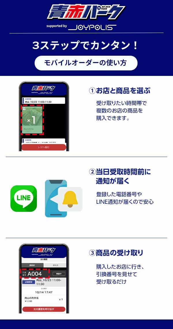 ・一度確定した注文は変更やキャンセルができません。青赤パークsupported by JOYPOLISの営業時間終了までに受け取りがない場合は廃棄させていただきます。