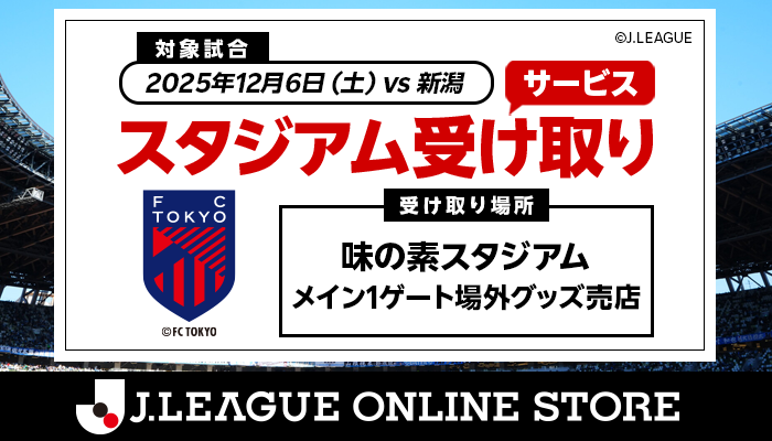 12月6日(土)アルビレックス新潟戦にて、Jリーグオンラインストアにて対象商品を事前購入いただくことで試合当日待機列に並ぶことなく商品を受け取れる『スタジアム受け取りサービス』を実施します。