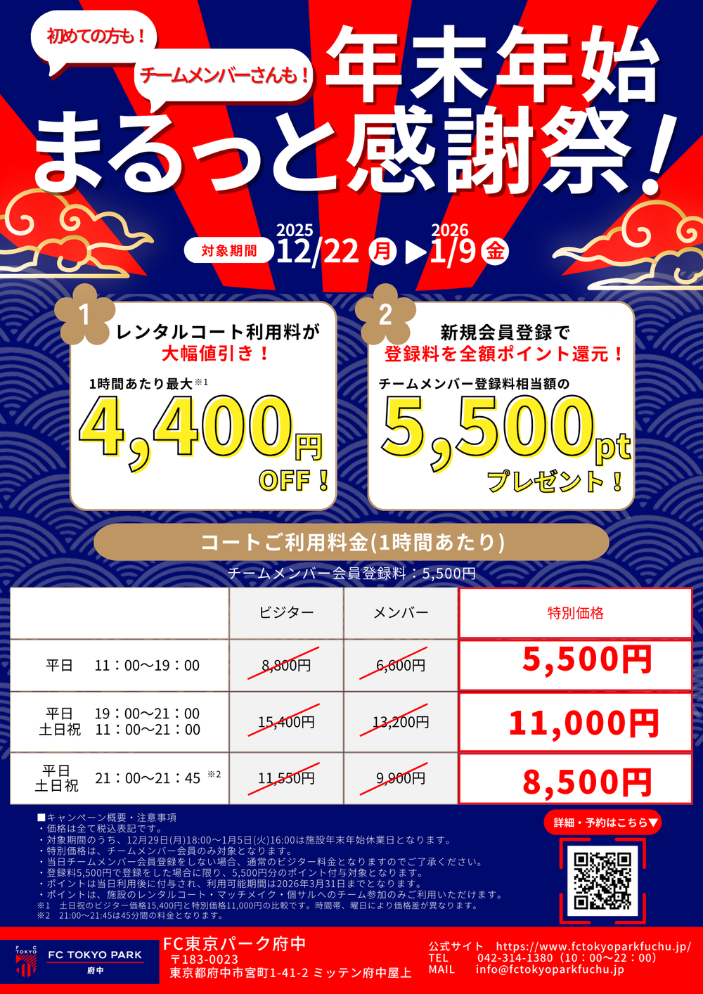 府中駅前のFC東京直営のフットサル施設『FC東京パーク府中』では、『年末年始まるっと感謝祭!』を開催します!