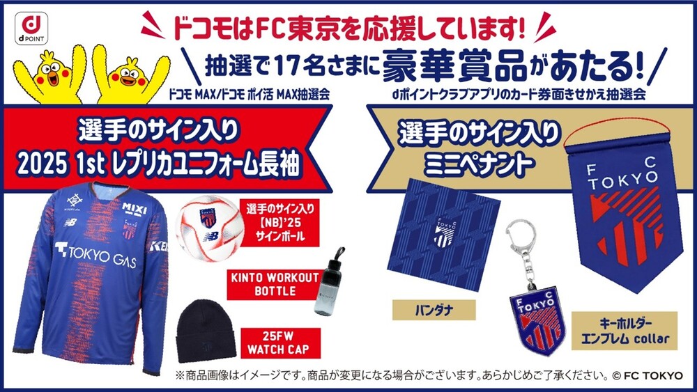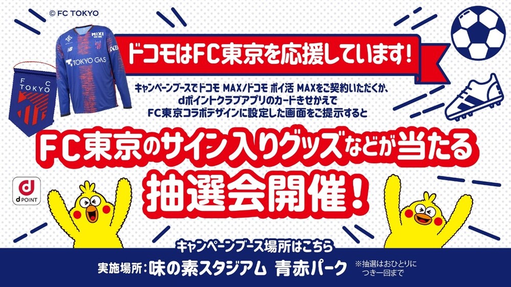 ブースでは、FC東京選手直筆サイン入りグッズ等が当たるdポイントクラブアプリのカード券面きせかえ抽選会とドコモMAX/ドコモポイ活MAX抽選会を開催します。