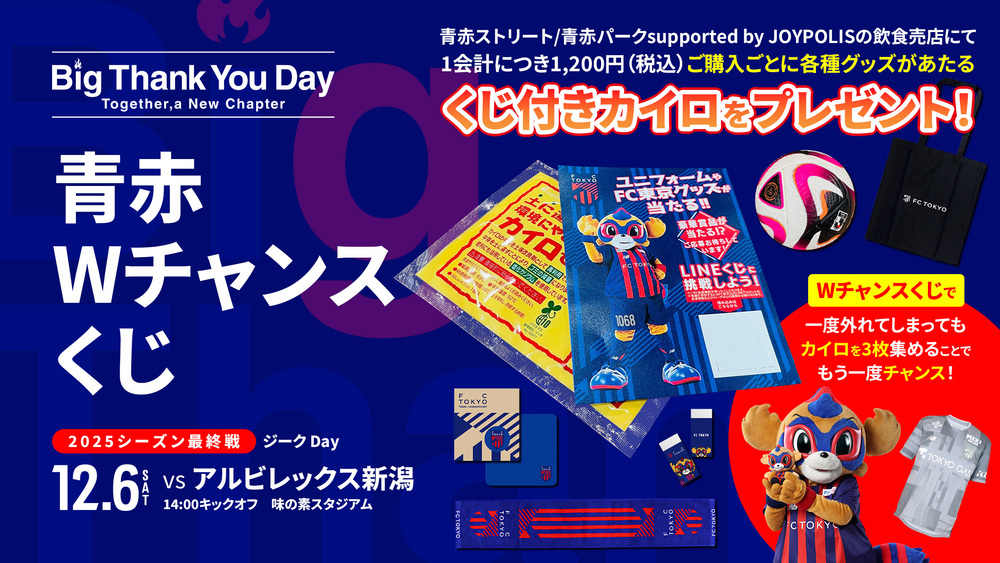 12月6日(土)2025明治安田J1リーグ 第38節 vsアルビレックス新潟(14:00キックオフ/味の素スタジアム)青赤ストリートおよび青赤パーク supporterd by JOYPOLISにて青赤Wチャンスくじを開催します。