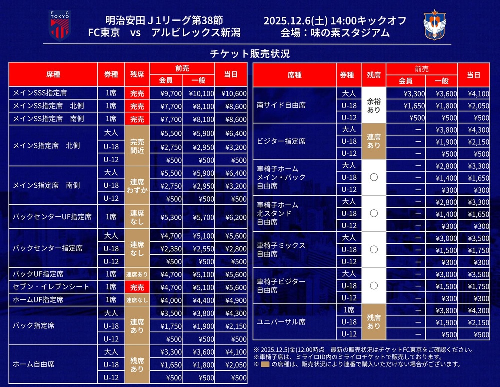 2025明治安田J1リーグ 第38節 FC東京 vsアルビレックス新潟(14:00キックオフ/味の素スタジアム)の当日券販売につきまして、下記のとおりお知らせいたします。
