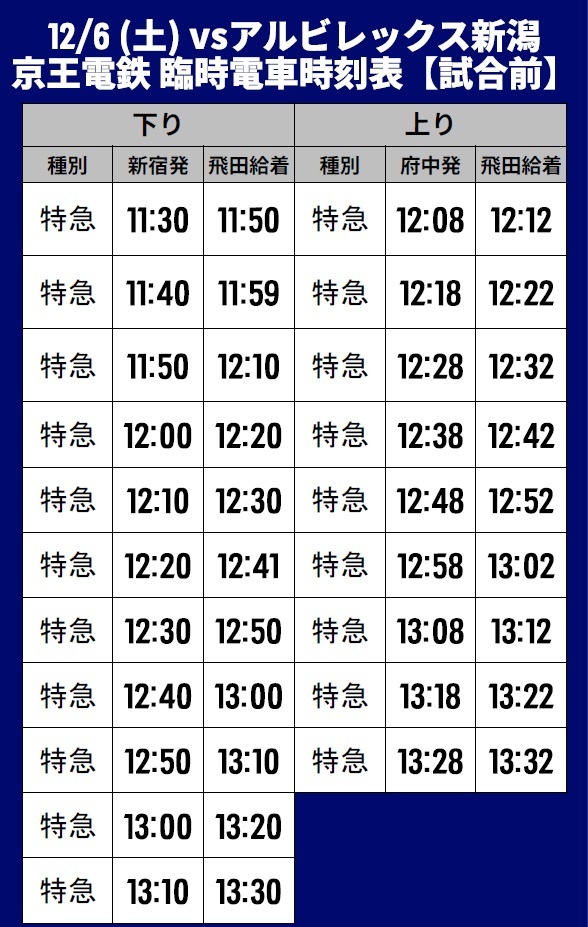 12月5日(土) 2025明治安田J1リーグ 第38節 vsアルビレックス新潟(14:00キックオフ/味の素スタジアム)にて運行される臨時交通アクセス(鉄道)、シャトルバス・路線バスについてご案内いたします。