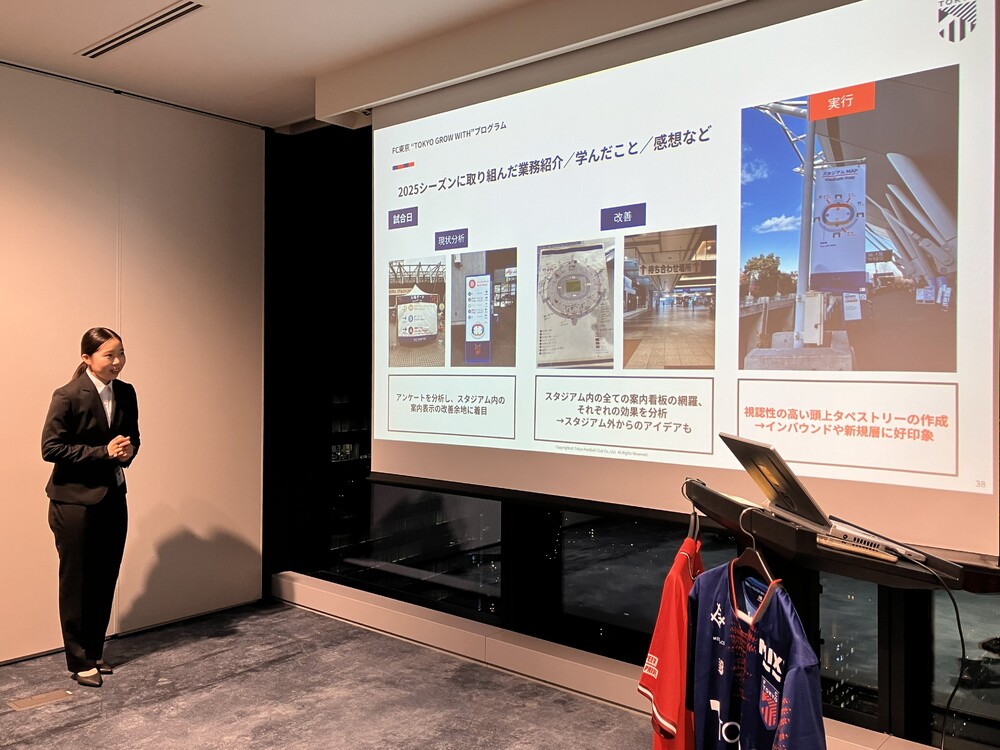 千葉ジェッツの学生インターン生から「TOKYO GROW WITHプログラムでの活動を通して意識していたことはありますか」と質問が寄せられると、FC東京の学生ビジネススタッフからは、「わからないことがあっても、すぐに社員のビジネススタッフへ頼るのではなく、まずは主体的に考える姿勢を大切にしていた」「ホームゲーム運営では、スタジアムに来場されるお客様の視点でどう見えるかを意識しながらバナーや掲示用POPを制作していた」と語り、活動の中で意識していたポイントを紹介していました。