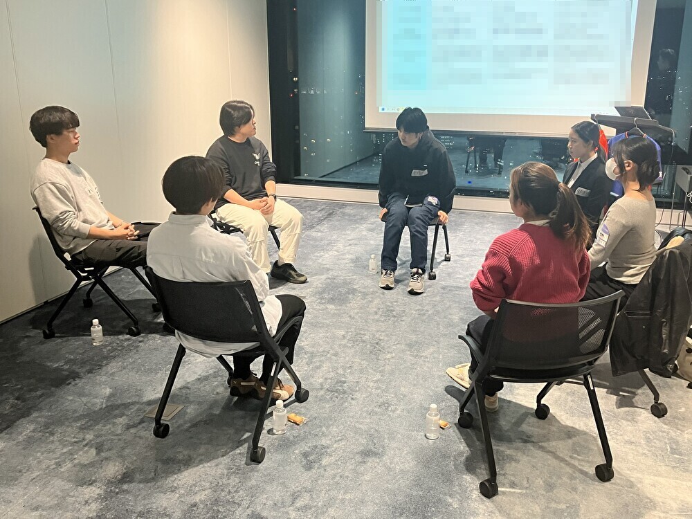 当日は、千葉ジェッツから3名の学生インターン生、FC東京から4名の学生ビジネススタッフが参加しました。両クラブの学生による自己紹介から始まり、各自が担当している業務の紹介や、ホームゲーム運営における役割、日々の学びなどを共有しました。さらに、10月にプログラムがスタートしたばかりの千葉ジェッツの学生から、4月から活動してきたFC東京の学生に向けて質問が寄せられ、後半は座談会形式で気軽に意見交換や歓談を行いました。