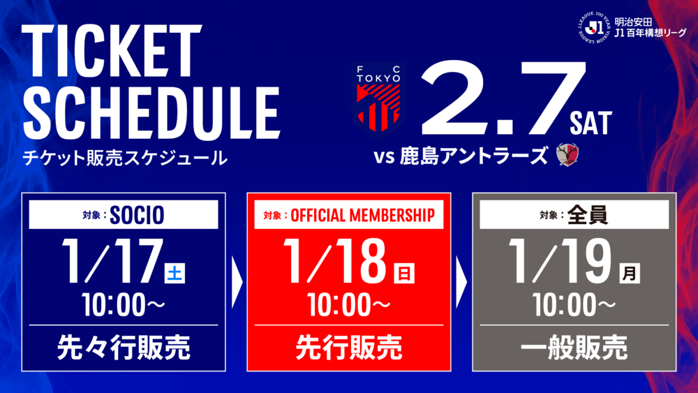 2月7日(土) 明治安田J1百年構想リーグ 第1節 vs 鹿島アントラーズ(13:30キックオフ/味の素スタジアム)のチケット販売に関してお知らせいたします。