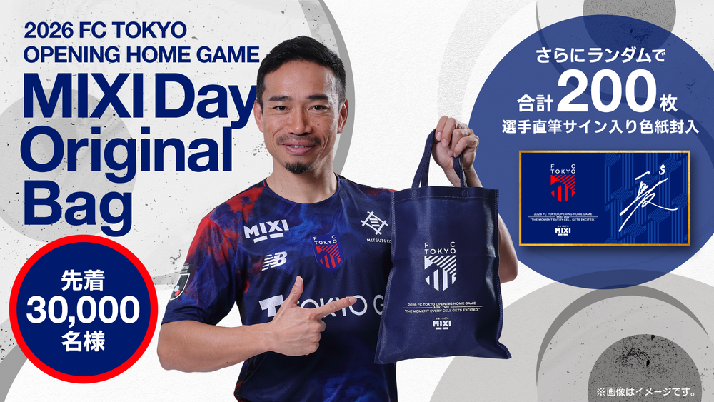 ご来場者先着30,000名様に企画タイトル入りのオリジナルバッグをプレゼント!さらに、ランダムで200名様に選手直筆サイン入りのMIXI Day限定ミニ色紙を封入してプレゼントします。