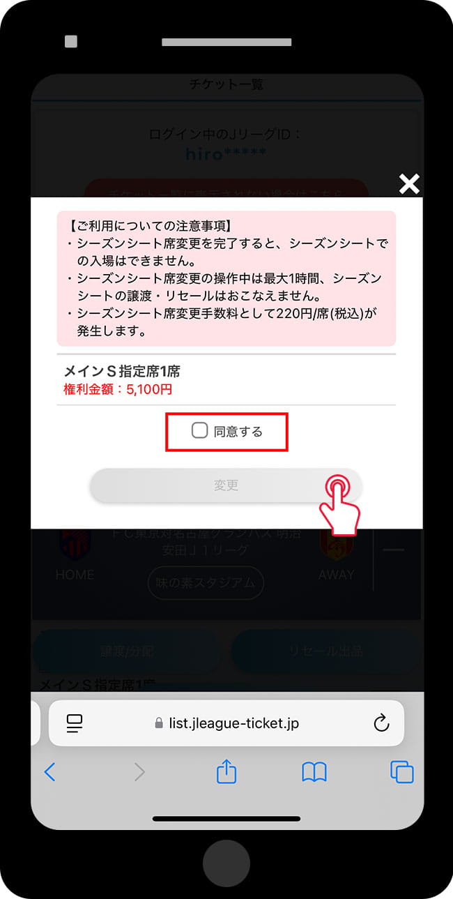 ※ Será exibido no topo "Alteração de assento do assento da temporada em andamento".