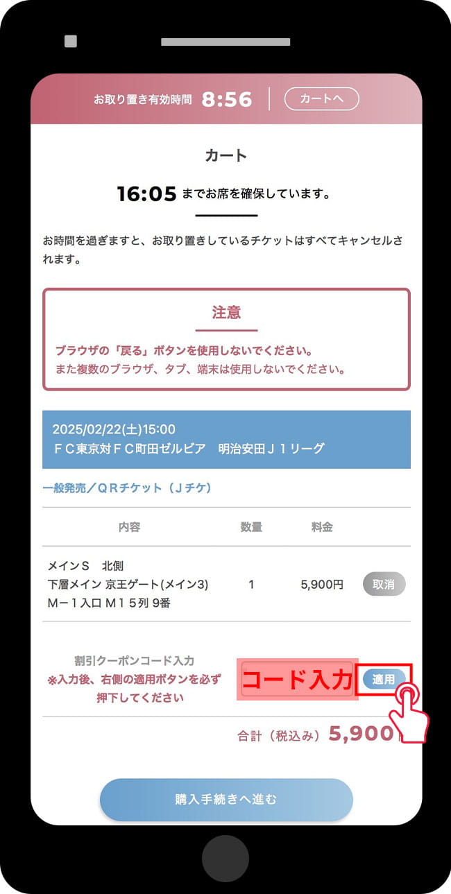 Ao utilizar o código de cupom de desconto listado na Minha Página ao comprar ingressos para assistir no Ticket FC Tokyo, o valor correspondente será descontado (ou você será convidado).