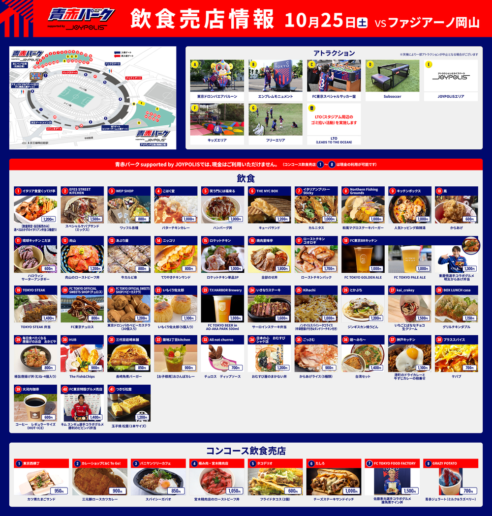 No dia 25 de outubro (Sáb) de 2025, na 35ª rodada da Meiji Yasuda J1 League, partida contra o Fagiano Okayama (início às 14:00 / Ajinomoto Stadium), informamos sobre as opções de alimentação e bebidas disponíveis no AO-AKA PARK supported by JOYPOLIS (fora do estádio), no evento itinerante!! AO-AKA PARK supported by JOYPOLIS, e nas lojas do corredor interno do estádio.