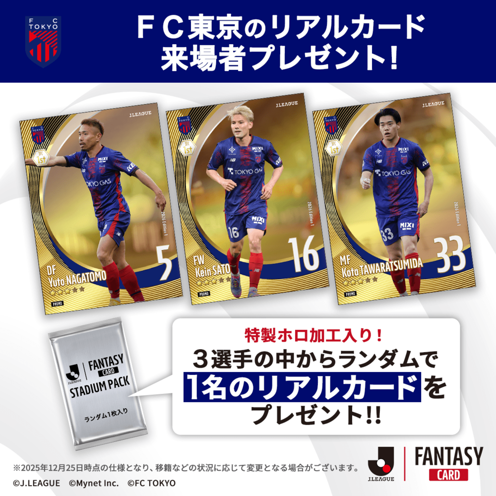 No dia 14 de fevereiro (Sáb), na 2ª rodada do Grupo EAST da Meiji Yasuda J1 Century Vision League, contra o Urawa Reds (início às 15:00 / Ajinomoto Stadium), serão distribuídos cartões reais do cartão digital oficial da J.League "J.LEAGUE FANTASY CARD" para os primeiros 30.000 visitantes.