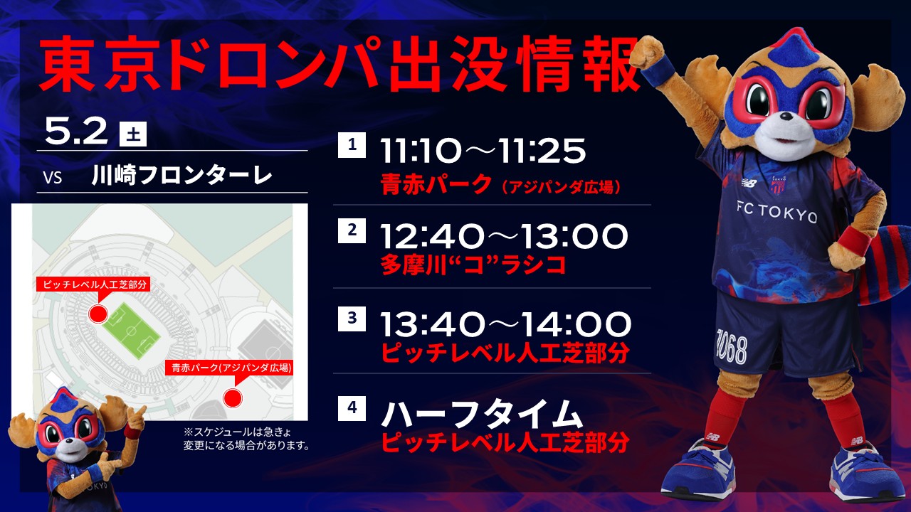 No dia 2 de maio (Sáb), na 14ª rodada da Meiji Yasuda J1 Century Vision League contra o Kawasaki Frontale (início às 14:00 no Ajinomoto Stadium), o TOKYO DOROMPA aparecerá conforme descrito abaixo.