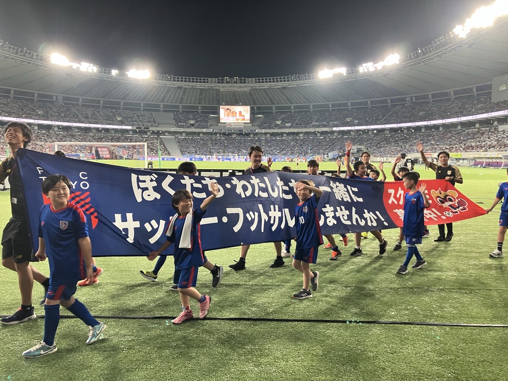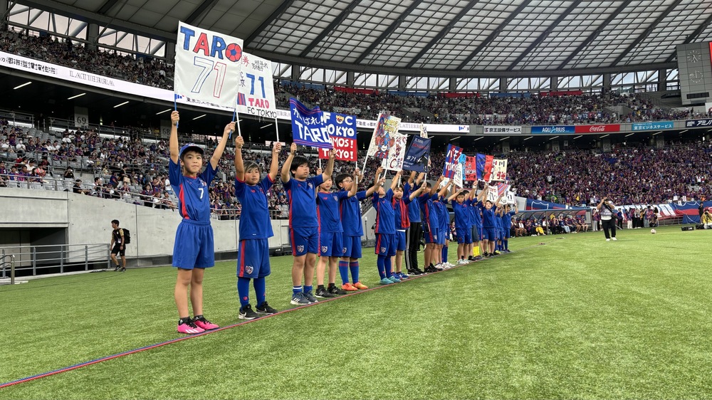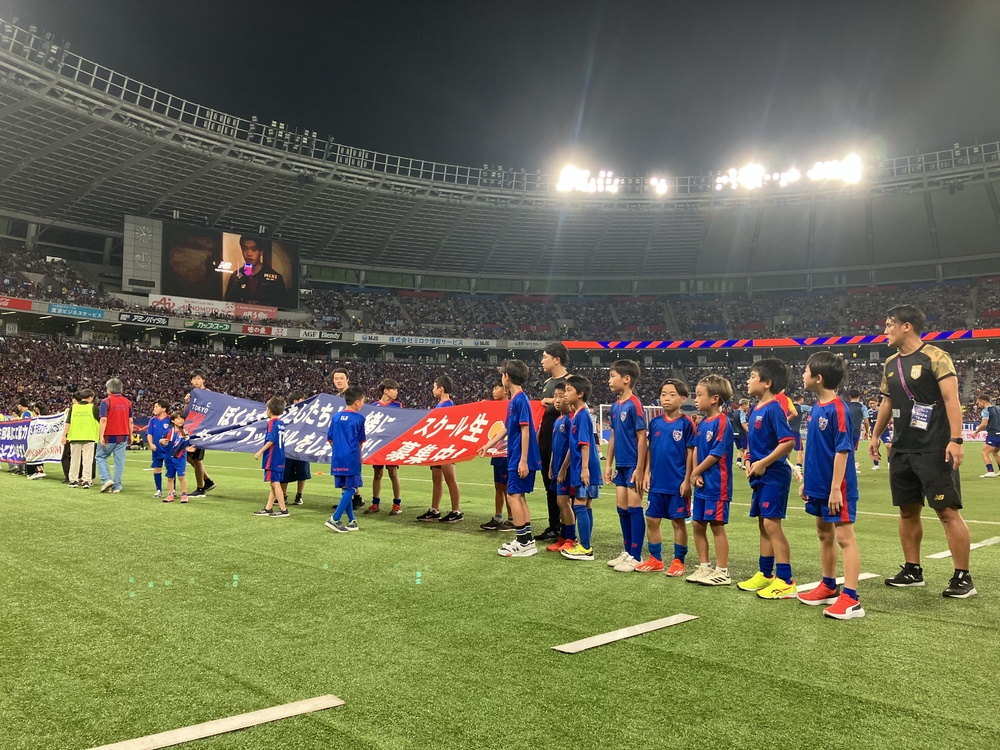 スクールでともに切磋琢磨する仲間を増やすためにバナーを持ってスタジアムを周回!