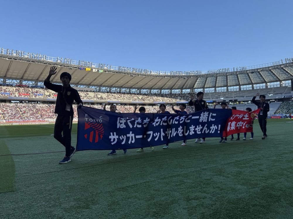 ハーフタイム時間を利用し、FC東京スクールのバナーを持ってアピール!