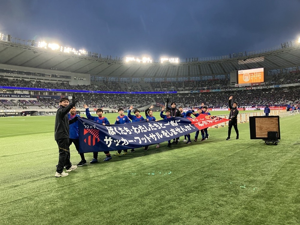ハーフタイムの時間を利用して、FC東京のスクールバナーを持ってスクールのアピール!