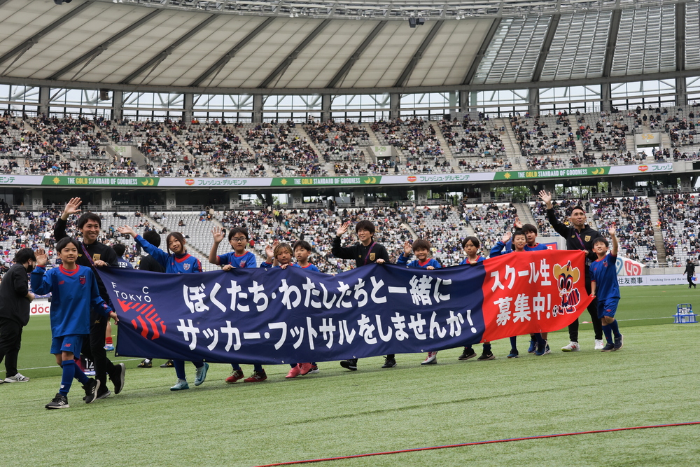 FC東京スクールのバナーをもって、ピッチを周回しました!