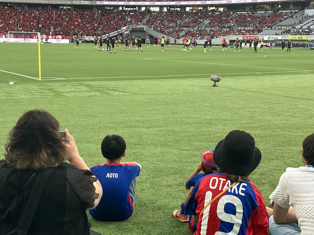 ピッチでは、実際に選手が座るベンチに腰かけたり、目の前に広がる美しい芝生や、ピッチから見上げる普段とは異なる競技場の風景に目を輝かせていました。