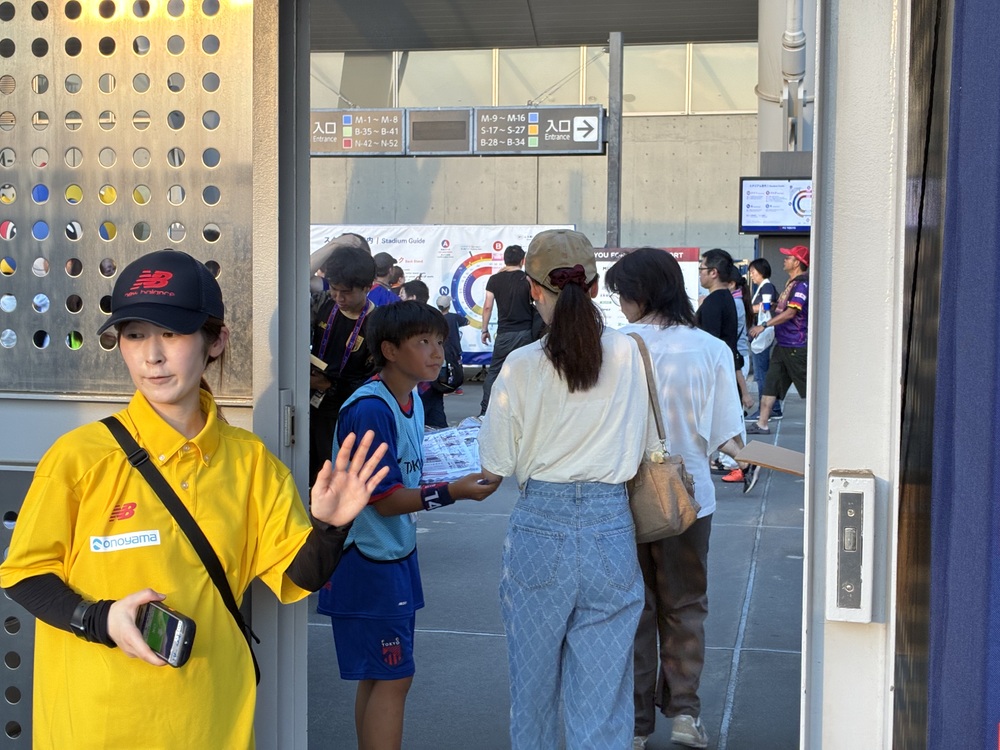 メイン入場口でのレジャーシート配布や選手カードの配布など、様々な業務を体験しました。