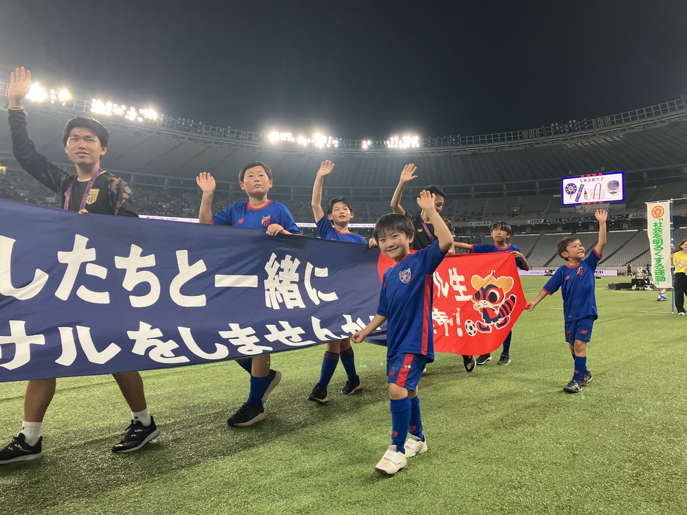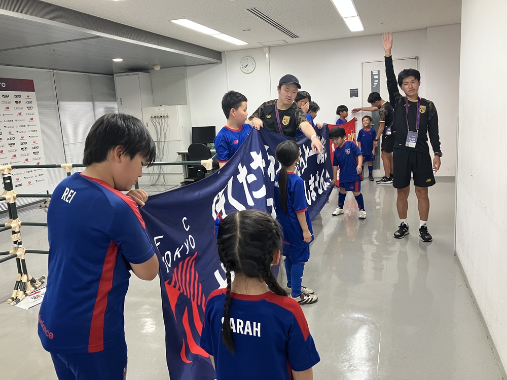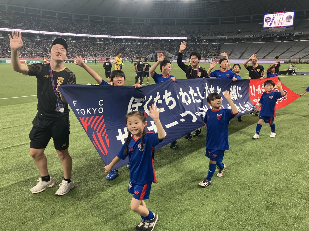 FC東京サッカー・フットサルスクールのバナーを掲げて元気にピッチを周回しました。