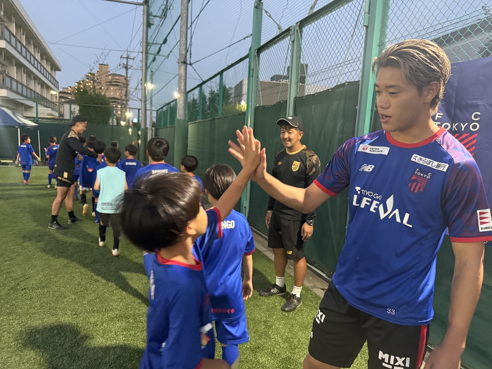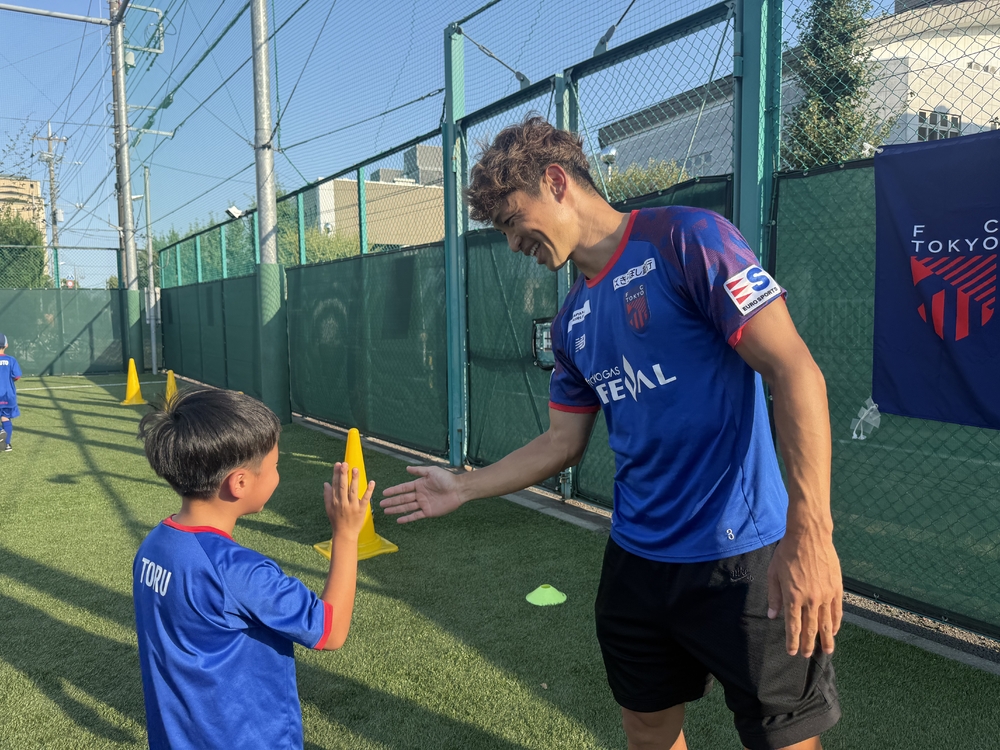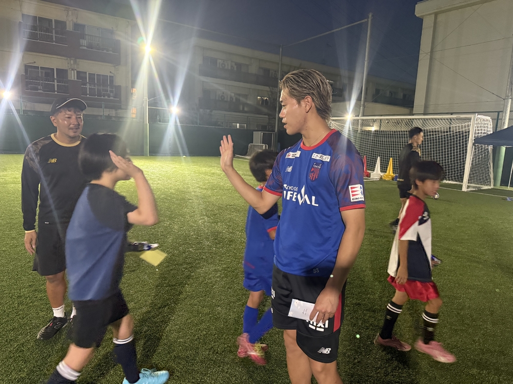 最後に「楽しくサッカーを取り組むためには健康も大事なのでご飯をしっかり食べる、休むことも忘れないでください!」とメッセージを伝え、スクール生たちと笑顔でハイタッチを交わしました♪