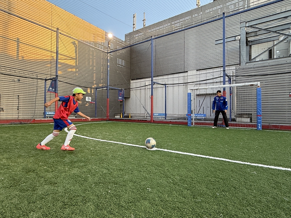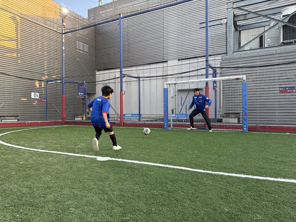ゴールキーパーとしてゴールに立つキム選手のプレーに、スクール生たちは目を輝かせながらシュートを放っていました!