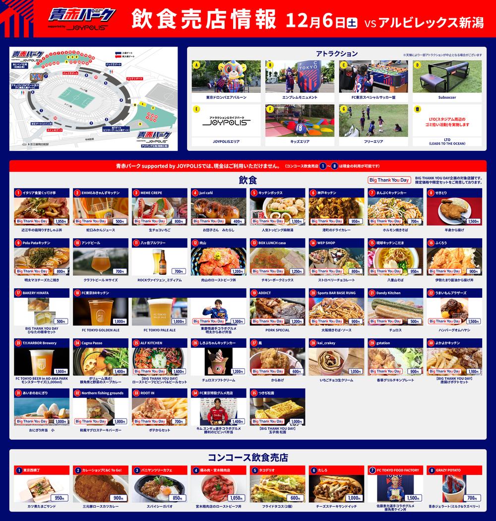 12月6日(周六)2025明治安田J1联赛 第38轮 vs Albirex新潟(14:00开球/味之素体育馆)的AO-AKA STREET、AO-AKA PARK supported by JOYPOLIS(场外)、出差!! AO-AKA PARK supported by JOYPOLIS、体育馆内通道(场内)售货亭的饮食信息通知。