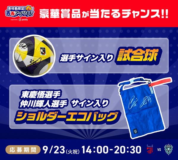 9月23日(週二節假日) 2025明治安田J1聯賽 第31節對Avispa福岡(18:00開球/味之素體育館)將舉辦利用FC東京官方應用程式的來場者限定『青赤App抽獎 supported by Paidy』活動。