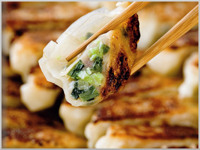 堅持原料的多汁巨無霸煎餃與韭菜包子。使用國產豬肉與高麗菜、青森縣產的大蒜、栃木縣產的韭菜、高知縣產的薑等新鮮肉類與蔬菜。