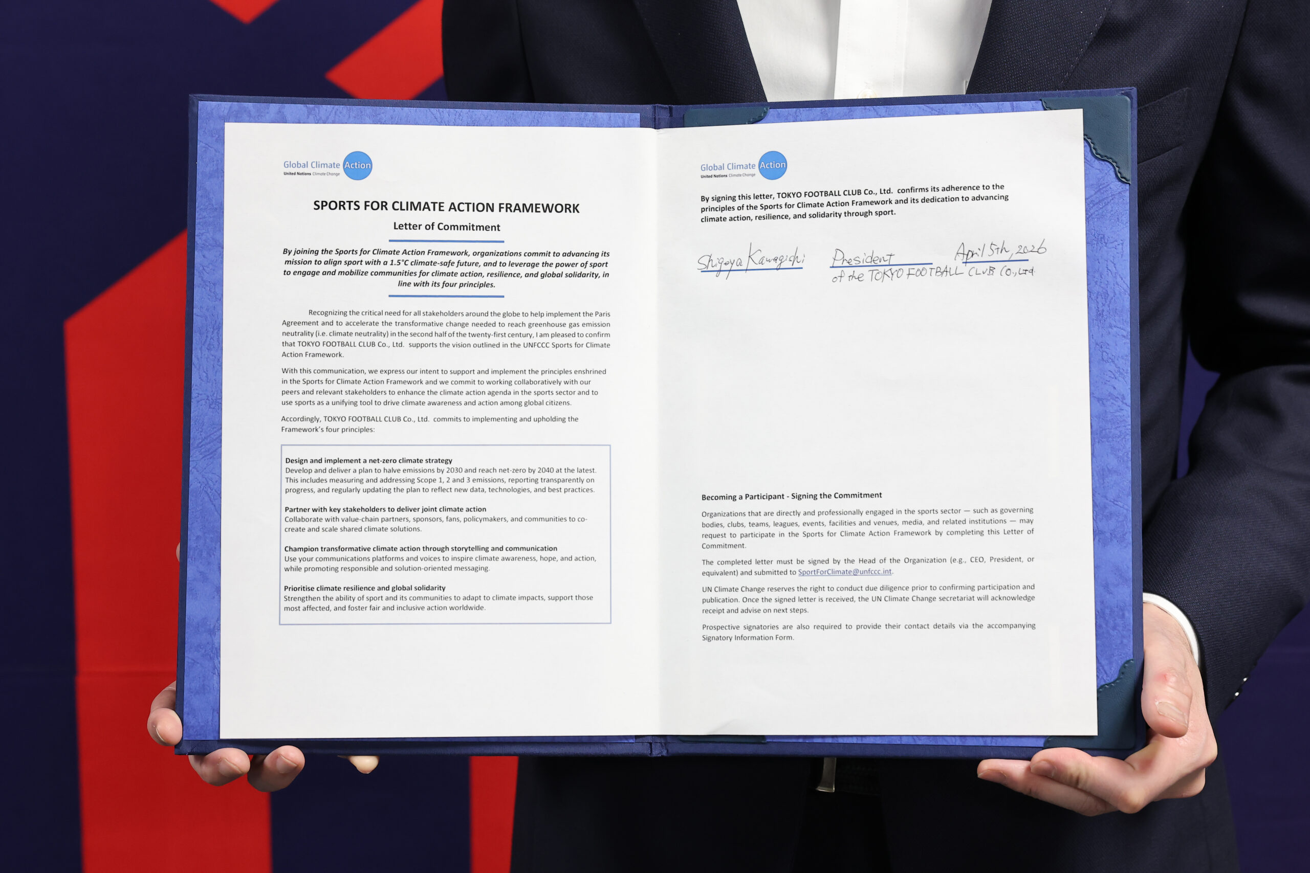 FC東京此次簽署了聯合國氣候變遷框架公約(UNFCCC)的「Sports for Climate Action Framework(透過運動推動氣候行動框架)」。承諾書上由代表取締役社長川岸滋也簽名。